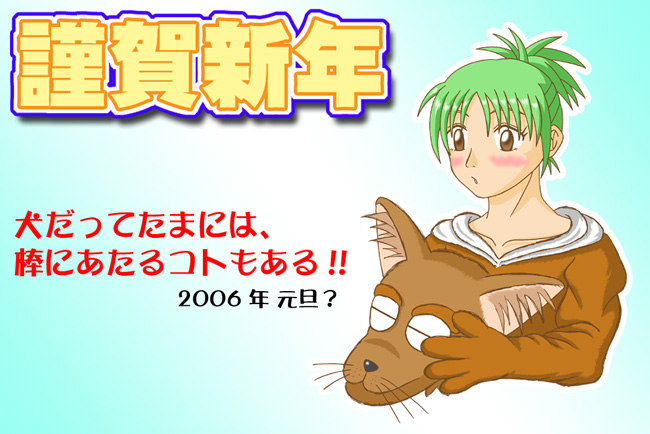 誰がどう見ても2006年の年賀状イラストです。 日記では「御家族に見られたくないような〜」とか書いてましたが、 そんなのは当然恥ずかしくて描きませんでした・・・描けませんでした。 どんなにするか散々悩んだ挙句、犬の着ぐるみに落ち着きました。 休憩中に被り物を脱いで「フゥ」と一息、って場面ですかね。 予定ではもっと可愛く描けてるハズなんですが(つД`) 「ぬいぐるみのフサフサ感」を出すのに、ものすっごい苦労しました。 その苦労が報われていれば良いんですけどね・・・。 あ、一緒に書かれてるコトワザ(?)の意味としては、 「誰でも失敗するコトくらいある。それに凹まず頑張ろうや」 そんなカンジです。皆さん頑張りましょう。 |