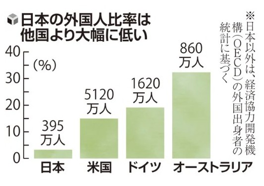 しかるに記事は「日本の外国人比率は他国より大幅に低い」とし、グラフをその証拠として問題視しているが、島国としての日本の歴史を考慮しない評価は筋違いの侮辱ではないのか。日本には犯罪率が低いなどの島国だからこその誇れる点が多数存在する。