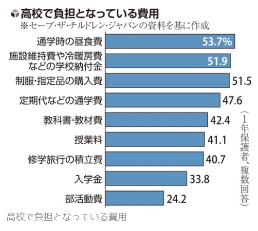 高校1年の保護者に入学時の心配事を複数回答で聞いたところ、最も多かったのは「経済的な理由により就学を続けられない可能性がある」で全体の45・0%、私立に限ると72・3%を占めた。回答した保護者からは修学旅行の積立金や部活動の費用が負担となっているとの声が上がったという。