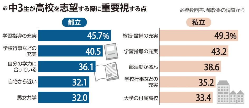 中3生が全日制の高校を志望する際に重要視する点を尋ねたところ、都立高は「学習指導の充実」が45・7%でトップ、「学校行事などの充実」が40・5%で続いた。「自分の学力に合っている」(36・1%)、「自宅から近い」(32・1%)も目立った。