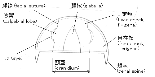 cheek)に分けられています。この線は三葉虫が脱皮するときの頭部の分かれ目であったらしく、化石化した脱皮殻ではこの部分が分離していることが多いです。なお、かっては三葉虫の分類にこの顔線の特徴(下記)が用いられていました。(現在でも、分類の鍵のひとつとしてもちいられています。)
