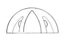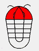 三葉虫の頭部は、中軸から連続する中央でもりあがった部分−頭鞍(glabella)−と、その左右と前を取り囲む頬(cheek)からなっています。(この両者を仕切る溝が、軸溝(axial