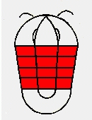 三葉虫の胸部は同型の体節が連なって出来ています。この体節数はそれぞれの種によって異なりますが、最小のもので5節、最大のもので40節ありますが、大部分は8〜13節です。(ちなみにかっては体節が2〜3節のものを少節型(miomeric)、5節以上のものを多節型(polymeric)と呼んでいましたが、現在では少節型とされたアグノスタス類は別系の動物とみなせるため、この分類も怪しくなっています。) なお、三葉虫の胸部の中軸部には消化管や血管が貫いていました。