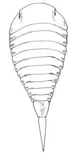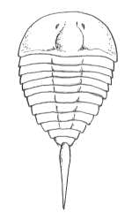 まず、図をみてください。三葉虫にしては変な形をしていますね。まるで、三葉虫の尻に剣がついているようです。これは三葉虫の一種ではなく、カブトガニの祖先に近縁な化石動物、「光楯類」です。彼らのからだは1対の単眼と単肢形の6対の付属肢(三葉虫の場合は1対の触覚と3対の二肢形の付属肢)をもつ頭部と、12節の可動式の胴節、及び剣尾からなっています。また、この仲間の最古の種パラエオメルス・ハミルトニィ [Palaeomerus hamiltoni]はカブトガニのような特徴とともに、ウミサソリ類(古生代にのみ生存していた節足動物の分類群。)の特徴もあわせもっており、この両者の祖先と目されています。