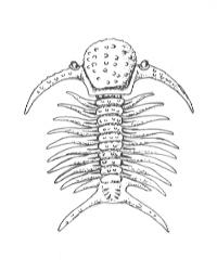 三葉虫の中には棘状の構造をもつものも多いのですが、ここで紹介するダイフォンは特に変わった構造をもっています。左図をみてください。普通重なり合っている側葉が棘状になっており、また頭部も頬が棘状になっています。まるでマンガで描いた骸骨のようです。目は前方をむくようについていていますので、たぶんこの種は浮遊生活を送っていたのではないでしょうか?