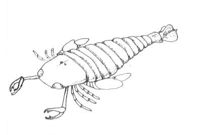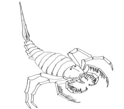 三葉虫と近縁とされる節足動物である鋏角類には、現生種もいるカブトガニ類・蜘蛛(クモ)類・サソリ類・ウミグモ類がありますが、それ以外にも絶滅した分類群がいくつか存在します。そのなかのひとつがここで紹介するウミサソリ類[Euryptterids]です。彼らは三葉虫に近縁な光楯類[Aglaspids]の中より進化しデヴォン紀には最盛期をむかえました。体長は2.3mに達したものいますが多くは5〜10p程度のものが多かったようです。