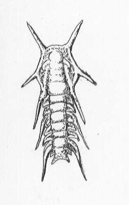 図を見てください。まるで昆虫のようなものが描いてますね。でもこれも三葉虫なんです。棘のついた六角形の頭をもつこの三葉虫はオレネロイデス[Genus Olenelloides]といいます。これはかなり新しい時代の特殊化した三葉虫かと思えば、さにあらず、三葉虫でも最古の部類、カンブリア紀前期の三葉虫です。三葉虫は出現当時より形態のバリエーションに富んだ生物だったようです。
