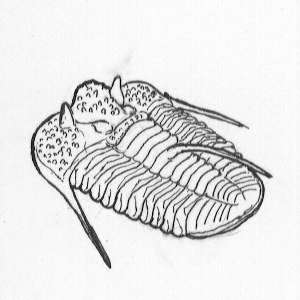 時代はデヴォン紀。三葉虫類はカンブリア紀時代程の繁栄はありませんでしたが、各種の個性的な種類を生み出しました。ここで紹介するオタリオン類はそんな種属の一つで後述するプロエタス類に近縁の三葉虫です。目の目立つ丸い頭の頬には長い頬棘が、背中には軸部から飛び出し内向きにカールした棘が生えています。この3本の棘がこの属の特徴です。でもこの背中の棘は何に使ったのでしょう?