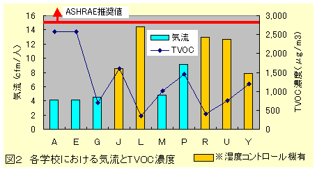 調査した10の学校は、これまでIAQ問題がなかった学校で、そのうち5つの学校は、湿度コントロールシステム(加湿/除湿の両方の機能付)が設置されていました。そして二酸化炭素(CO2)、一酸化炭素(CO)、揮発性有機化合物(VOCs)、細菌由来の揮発性有機化合物(MVOC)、粒子状物質、空気中の細菌、温度、相対湿度、換気率を測定しています。全てのデータの解析が完了していませんが、教室内の二酸化炭素(CO2)濃度、空気中の細菌数、総揮発性有機化合物(TVOC)濃度と、一人当たりの気流(1cfm=0.5 l/s)との関係について、報告されています。図2にはその中からTVOCと気流の関係について示します[1]。また表1には、今回調査した10の学校のHVACシステムに関わる問題点を示します。