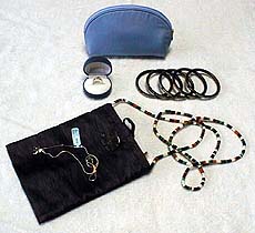シルクのドレス、化粧品を入れる竹細工のバッグ、木工製のコーヒーカップ、