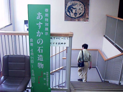 1階を見終えて地下へと進む星野先生。特別展示の「あすかの石造物」展が開催されている。 |