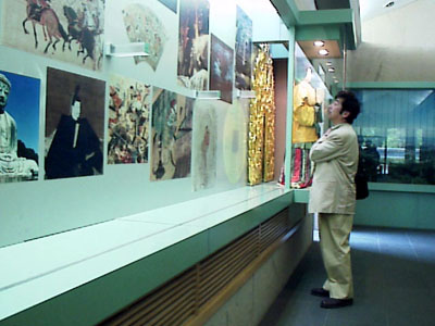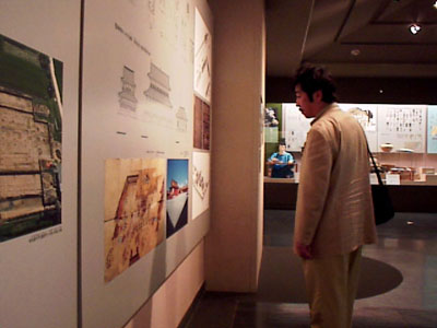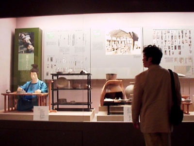 左手に見える人形は当時のお役人の執務風景だそうです。「都のくらし」コーナーでのショット。 |