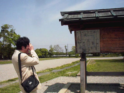 北側に位置する入口に立ち撮影する星野先生。ここからは藤原宮跡を一望する事ができる。 |