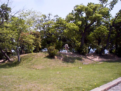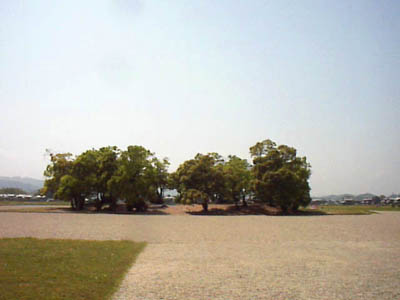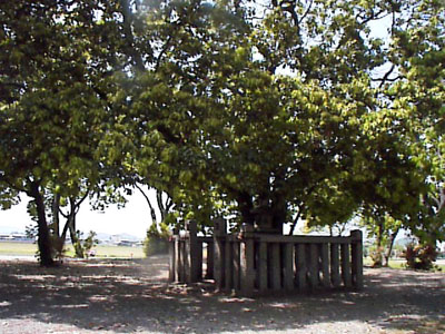 木立の中ほどに石柱で囲まれた大樹があった。藤原宮の御神木なのだろうか。 |