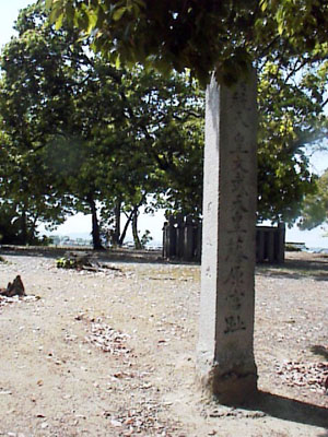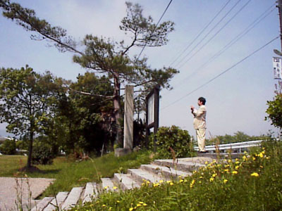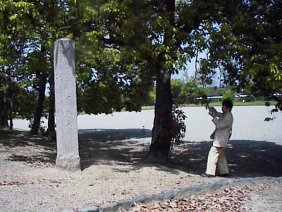 大樹に囲まれた中に記念碑が立っている。早速カメラに収める星野先生。 |
