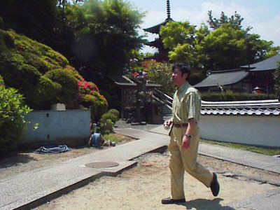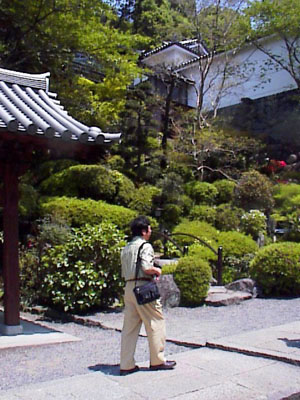 仁王門を抜け、奇麗に手入れされた庭園を行く星野先生。 |