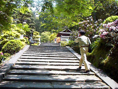 その本堂への石段を行く星野先生。周りの木々や草花が実に奇麗。 |