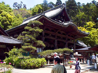 石段を登りきり、これから本堂へ。後ろに三重宝塔が見える。 |