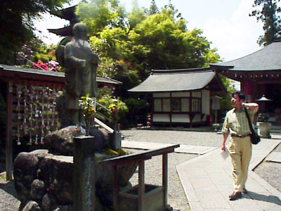 外れに立っている"修行大師像"こと"弘法大師"の石像を見上げる星野先生。それにしても何と縁の寺の多いことか。 |