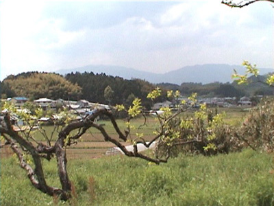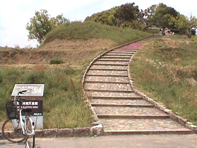 下りの階段右手方向にはのどかな田園風景が広がる。天皇陵は田園に囲まれた小山と言ってもいい。 |