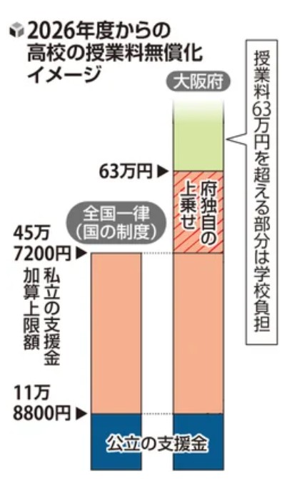 大阪府には独自の手厚い就学支援がある。国の就学支援金制度に上乗せを行い、上限額を超えた私立の授業料分は学校が負担する制度を導入している。国の制度では、支援対象外となる私立の施設整備費(全国平均年間16万円)も、支援対象としている。