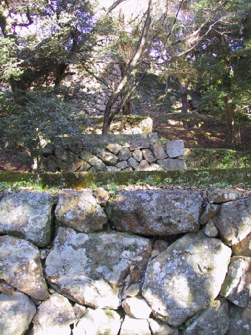 11月21日、朝から再登城。護国神社参道の左を、約100m登ると三の丸広場に出る。NHK送信所、護国神社などがあり司馬遼太郎の文章碑がある。この北西隅に(二の丸入り口)津和野城から移築された城門。ここから二の丸に入り、少し上ると本丸虎口に至る。10m四方の桝形をもつ虎口、堂々たるものだ。このあたり、石垣がよく残っている。本丸は50m四方ほどで松原湾の景観が良い。北に松原湾、南・西に浜田川、東は絶壁という縄張。ライテイングもこの時間、ほぼ満足。R9で一路東へ、